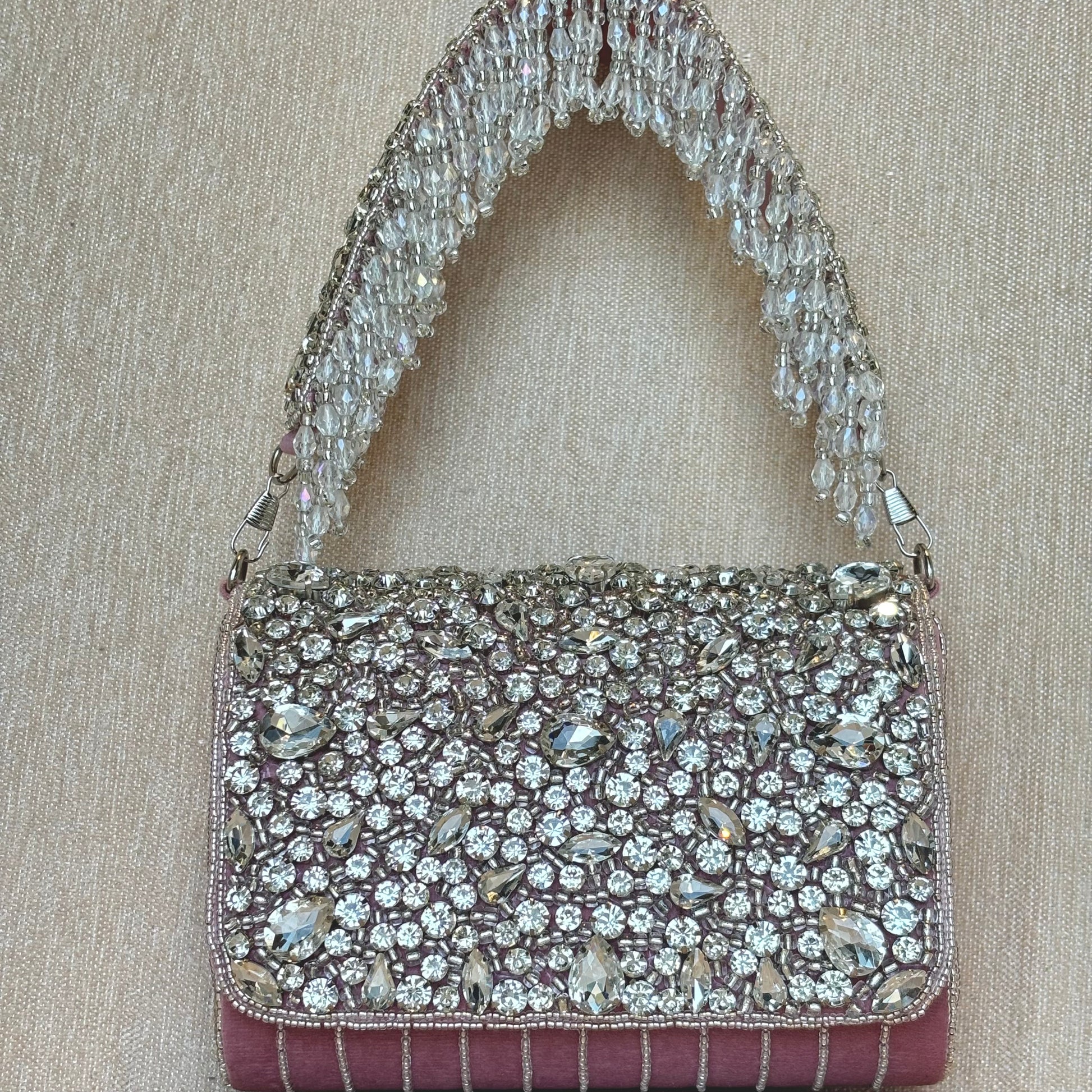 Introducing "Parineeti," our handmade Zircon Tassel Clutch, embodies elegance and charm, inspired by Bollywood's captivating style. Adorned with shimmering zircon stones and delicate tassel accents, this clutch adds sophistication to any outfit. Whether it's a night out or a special occasion, shine in the spotlight with this chic and unforgettable accessory.